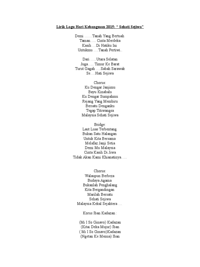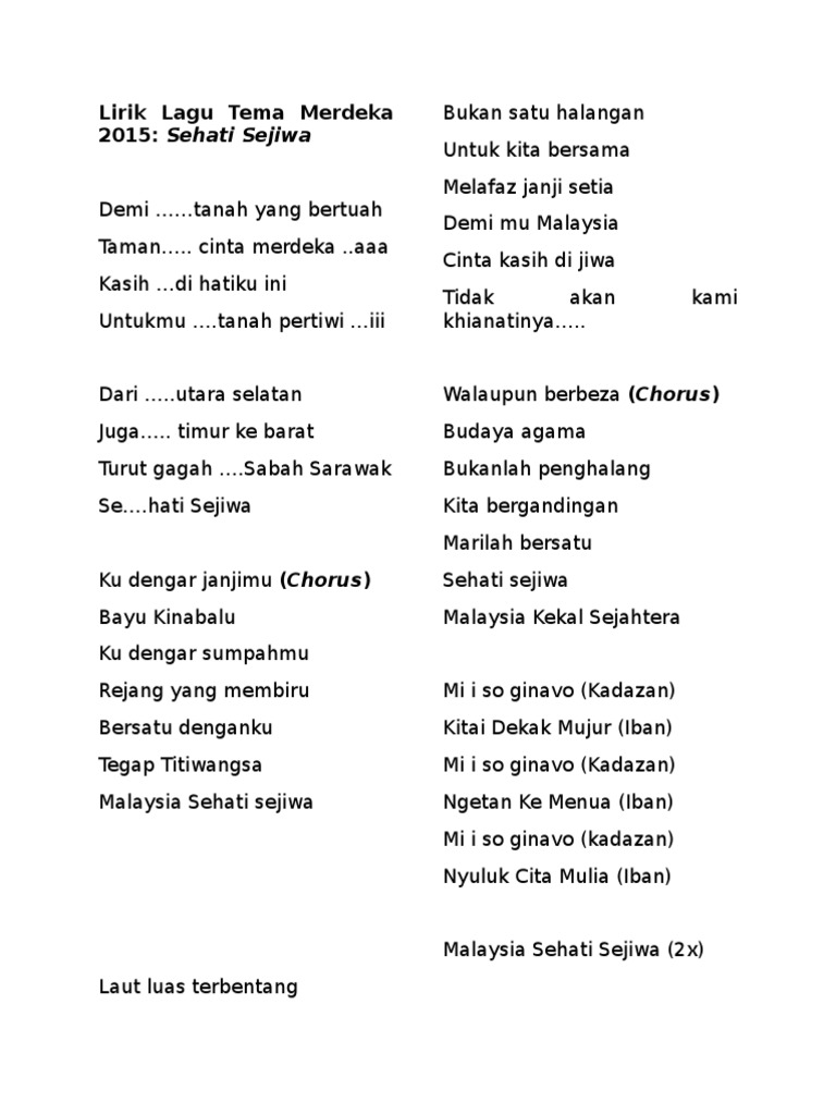 Doc Lirik Lagu Tema Merdeka 2015 Sehati Sejiwa Haf 8700 Academia Edu